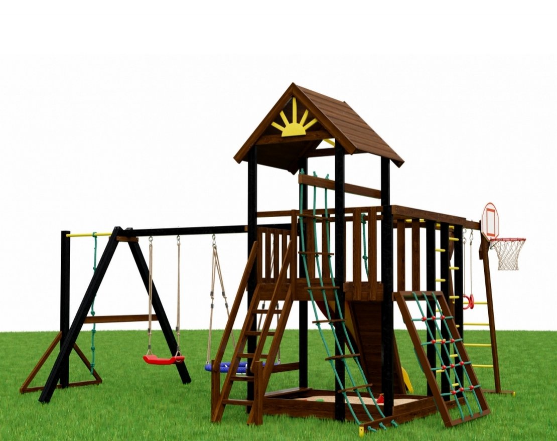 Игровая площадка Флорида 4 с расширенной комплектацией поможет сделать детей активнее, сильнее и здоровее. В ней сохранены все традиционные спортивные модули: качели, лестница, горная стенка, горка, кольцо, рукоход, но есть дополнения в виде турника с канатом и сетки для лазания.