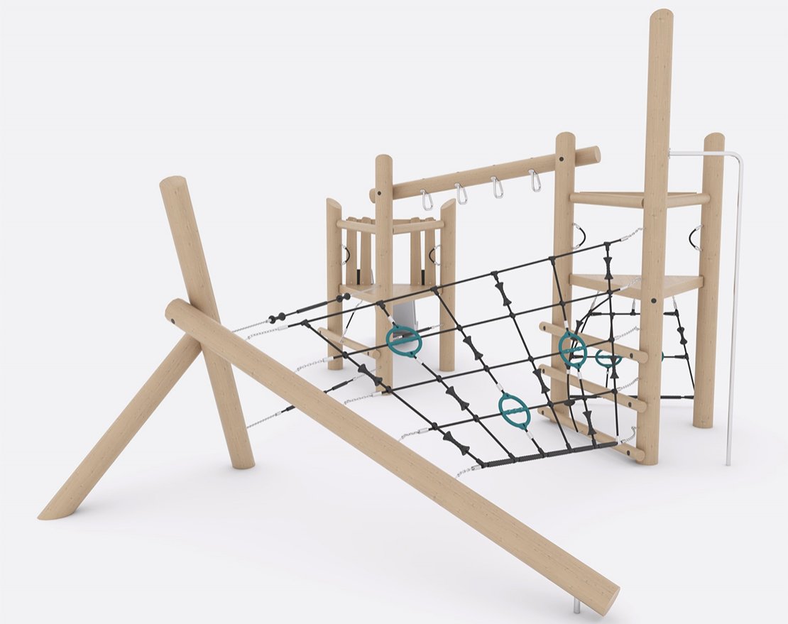 Состоит из опорных стоек, перекладин, канатной сетки и открытой металлической горки с защитными бортиками.