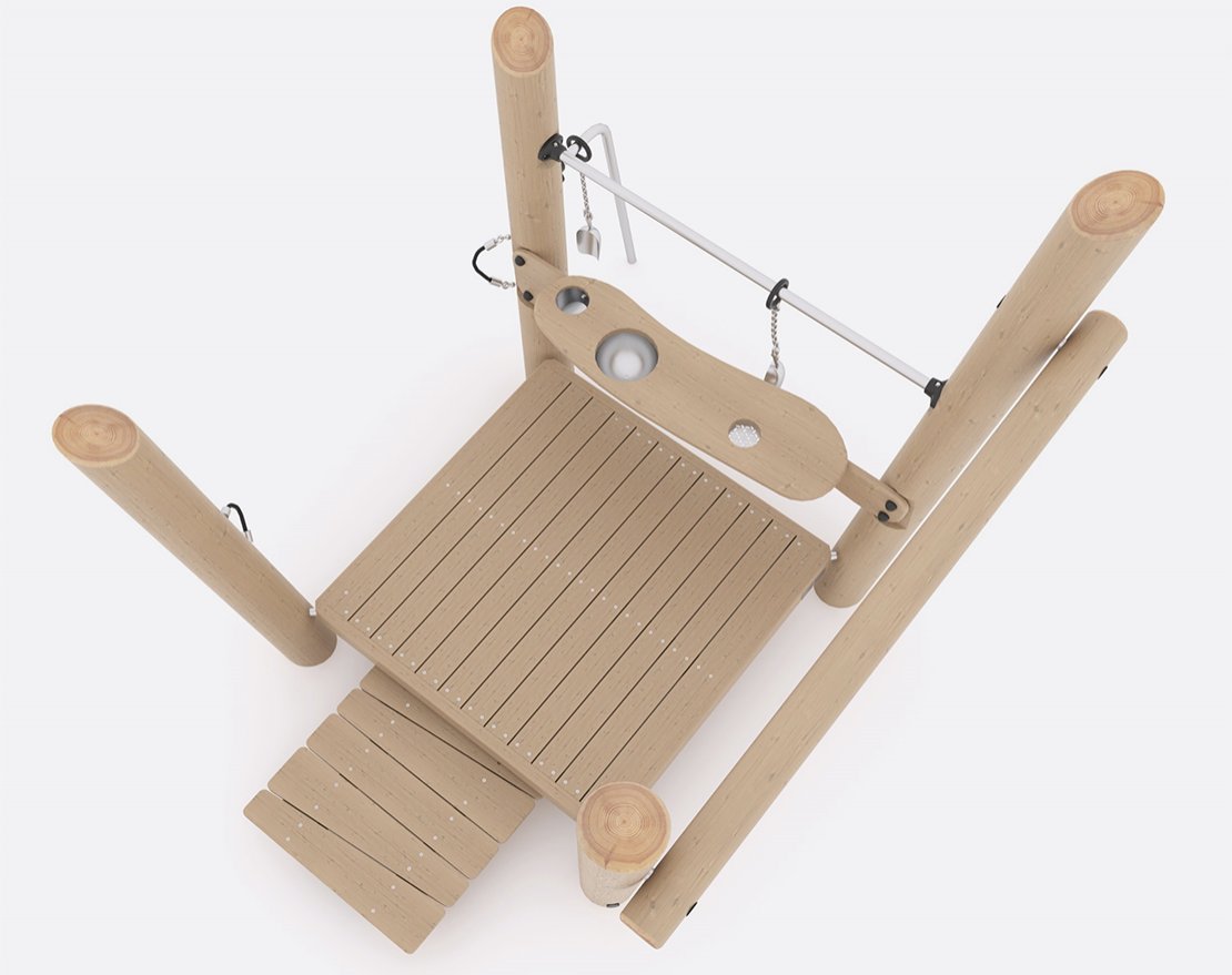 Состоит из опорных стоек, подиума и панели для игр с водой и песком. Панель оснащена металлическими ковшами, чашами.