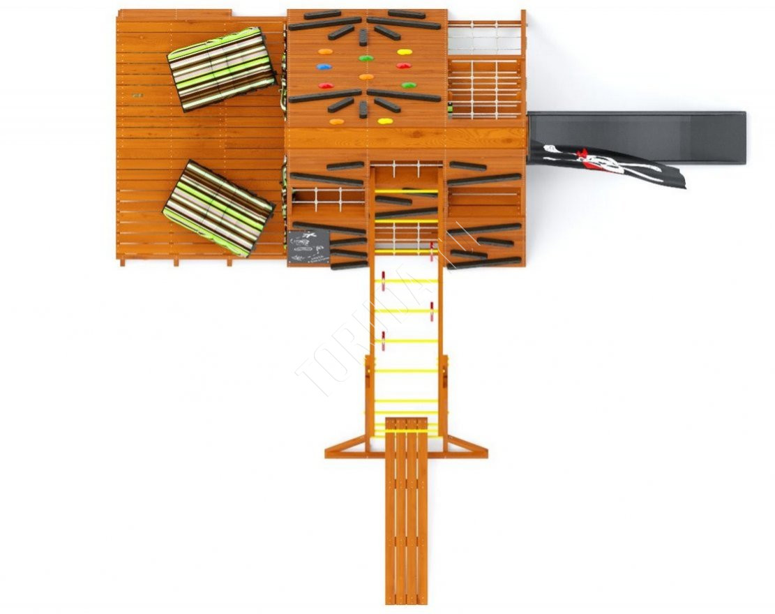 - Игровая площадка на дачу включает в себя огромное количество разнообразных игровых элементов. Ребята могут попробовать свои силы на рукоходе с кольцами и классическими перекладинами, потренировать ловкость и смекалку на большом наружном деревянном подиуме-сцене.