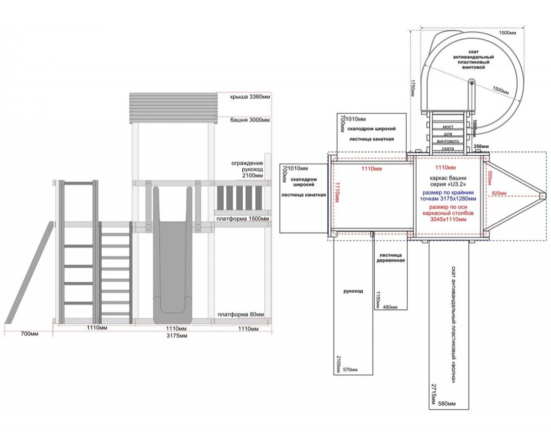 Основа детской игровой конструкции (конструктор) – башня «серия С» с двумя балконами (стандартный и угловой). Конструкция оснащена двускатной деревянной крышей, встроенным полом, пластиковым антивандальным скатом с превосходной скользящей поверхностью, антивандальным винтовым скатом с переходным мостиком, скалодромом, канатной лестницей с армированным канатом, «П»-образным рукоходом, деревянной лестницей, антивандальными пластиковыми игровыми панелями и штурвалом. Для безопасности ребенка предусмотрены перила на лестнице, заборчики и ограждения над зонами препятствий (скат).