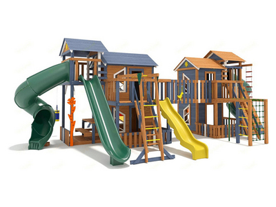 Грандиозный деревянный комплекс укомплектован сразу несколькими игровыми домиками, соединенными между собой переходами-мостиками. Это двухуровневые башни с домиками и верандами, с дизайнерскими окошками и четырьмя горками – волновыми разной длины и горками в виде труб.