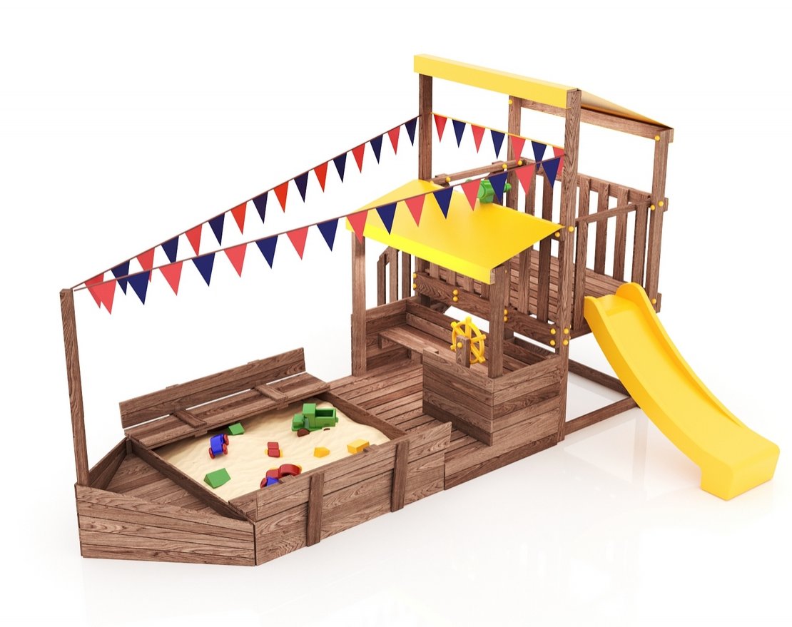 Детская песочница с крышками-лавочками и кораблик, включающий в себя штурманскую рубку и капитанский мостик с горкой с высоты 900 мм с флажками, а также две крыши закрытые тентом, чтобы можно было отправиться в дальнее плавание даже под дождем.
