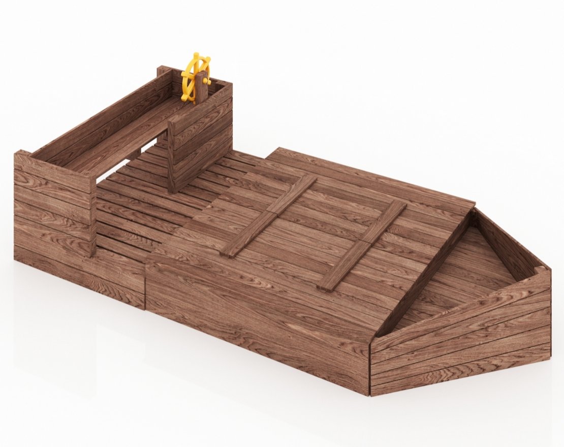Детская песочница-кораблик и штурманская рубка со штурвалом.