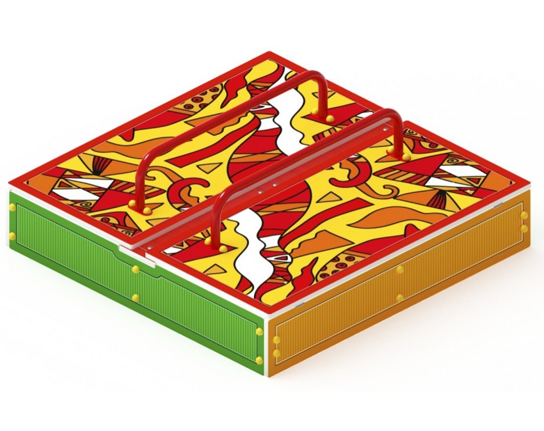 Выполнена из влагостойкой фанеры толщиной не менее 18 мм, кромки фанеры тщательно шлифованы, окрашена с нанесением рисунка. Крышка оснащена ручками из стальной трубы диаметром 22 мм, ручки окрашены порошковой краской в красный цвет. Крышка крепиться к бортам при помощи петель. Размеры: 1200х580 мм.
