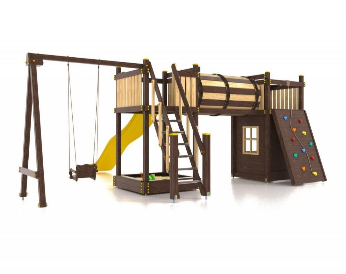 Изделие покрыто безопасной для детей высокоустойчивой пропиткой на водной основе, которая надежно защищает древесину от воздействия окружающей среды. Перила, скалодром и лестница производятся по системе "шип-паз".
