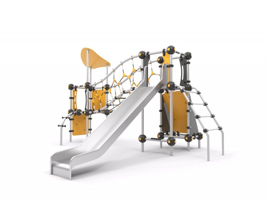 Состоит из металлического каркаса, канатного мостика, открытой горки с защитными бортиками и скалодромных панелей.