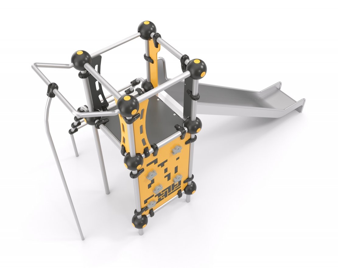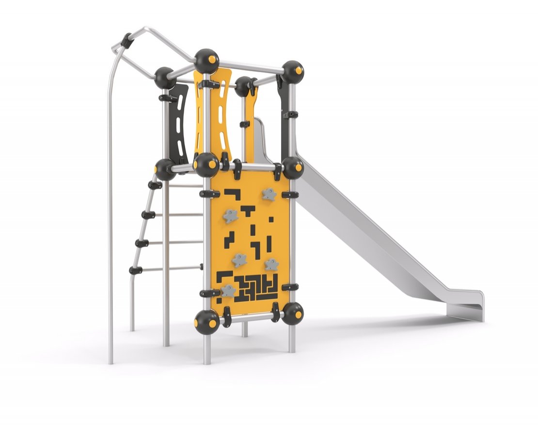 Представляет собой небольшую конструкцию, состоящую из открытой прямой горки с защитными бортиками, скалодромной панели, вертикальной трубы и металлической лестницы.