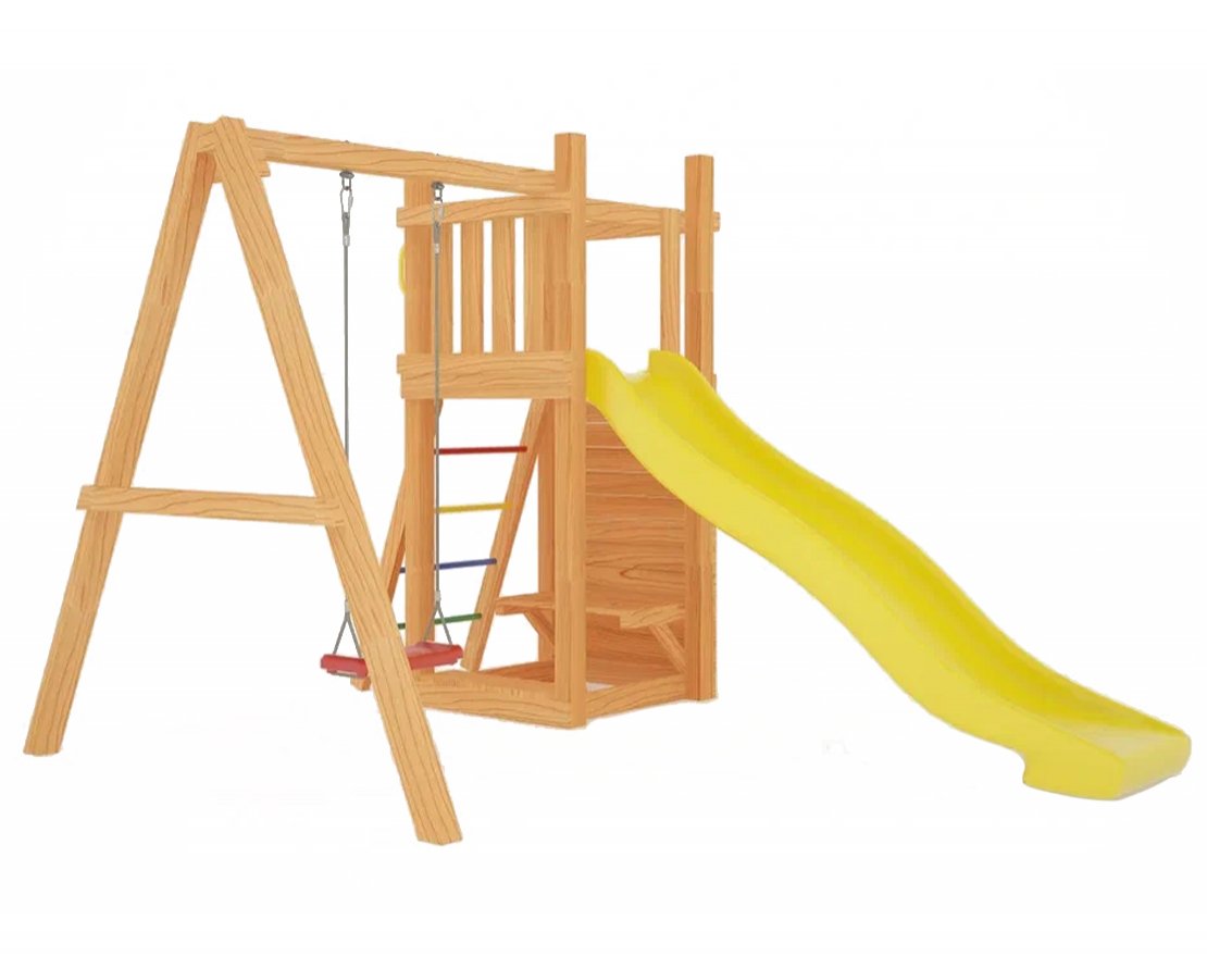 Площадка наполнит досуг детей энергией и радостью. Она компактная и займёт всего лишь несколько квадратных метров участка дачного или загородного дома. Покрытие с антисептиком защитит натуральные составляющие от непогоды (наносится самостоятельно).