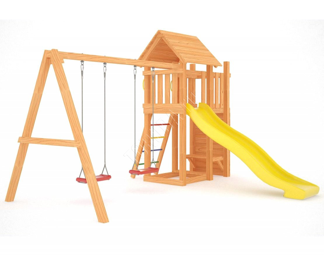 Комплекс безопасен: крепёжные соединения надёжно скрыты под колпачками, качельные подвесы выполнены по ГОСТ, спортивное бельгийское оборудование имеет дополнительный запас прочности.
