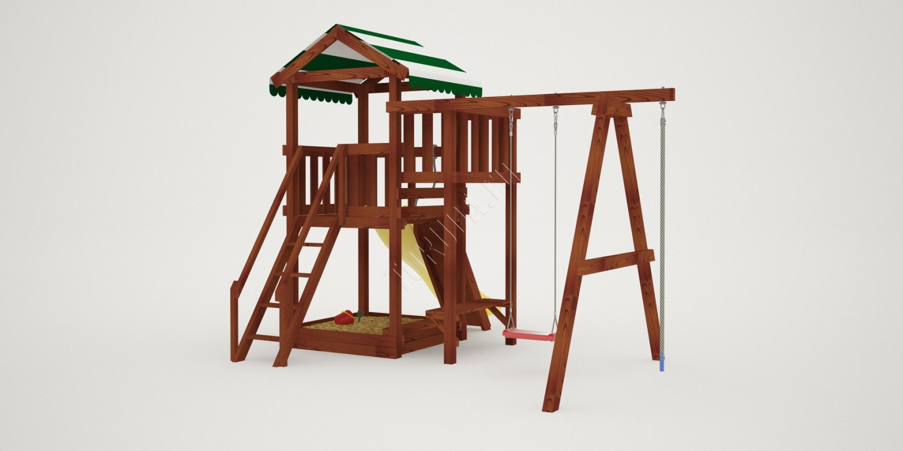 Также в модели есть еще один дополнительный канат для полноценного лазания – он расположен слева от качелей. Для любителей более спокойных игр предусмотрена песочница с удобной лавочкой для игральных принадлежностей.
