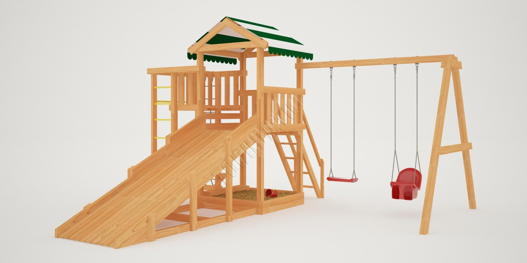 Конструкция сертифицирована и безопасна. Крепежи скрыты под хорошо закрепленными заглушками – поэтому даже малыши не поранятся. Каркас состоит из натуральных деталей – клееного бруса квадратного сечения со стороной 75 мм. Во избежание получения заноз и ссадин дерево отшлифовано, а края скруглены. Материал экологичен и не имеет лакокрасочного покрытия.