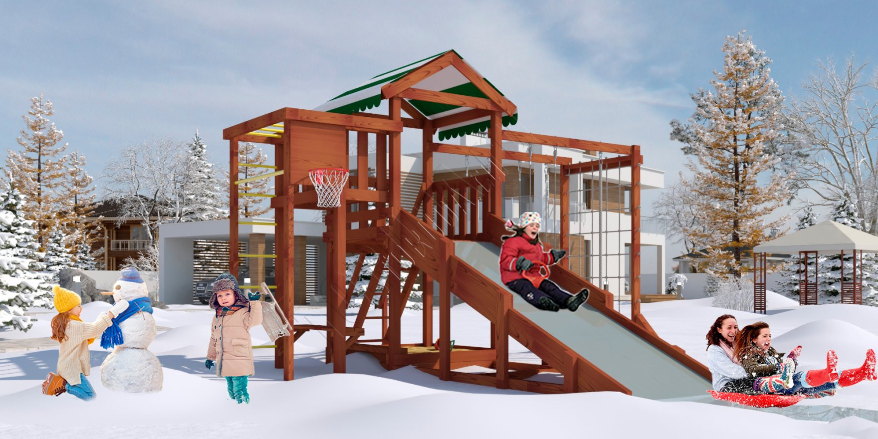 Площадка Гарда 4 (Бри) всесезонная вмещает несколько детей дошкольного и младшего школьного возраста. Удобное размещение – участок дачного дома. Она всесезонная – активно и весело проводить время можно и летом, и зимой. Ее легко собрать самостоятельно, можно заказать сборку.