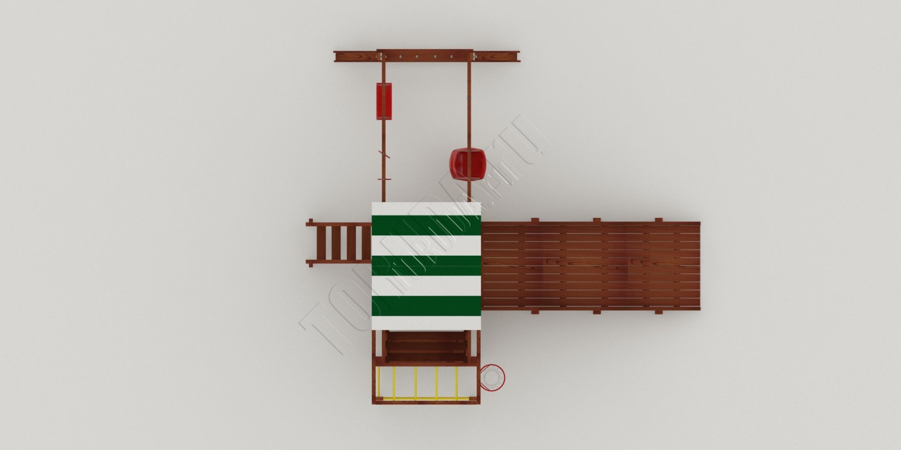 В основе натуральный материал – клееный брус 75х75 мм, который не меняет геометрию со временем, не скрипит и не рассыхается. Конструкция и элементы качельных подвесов разработаны и произведены согласно ГОСТ.