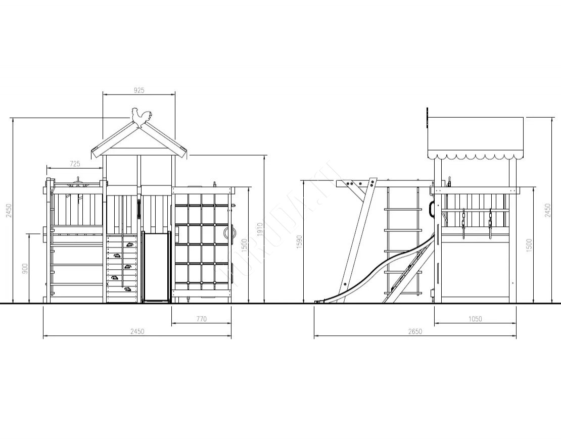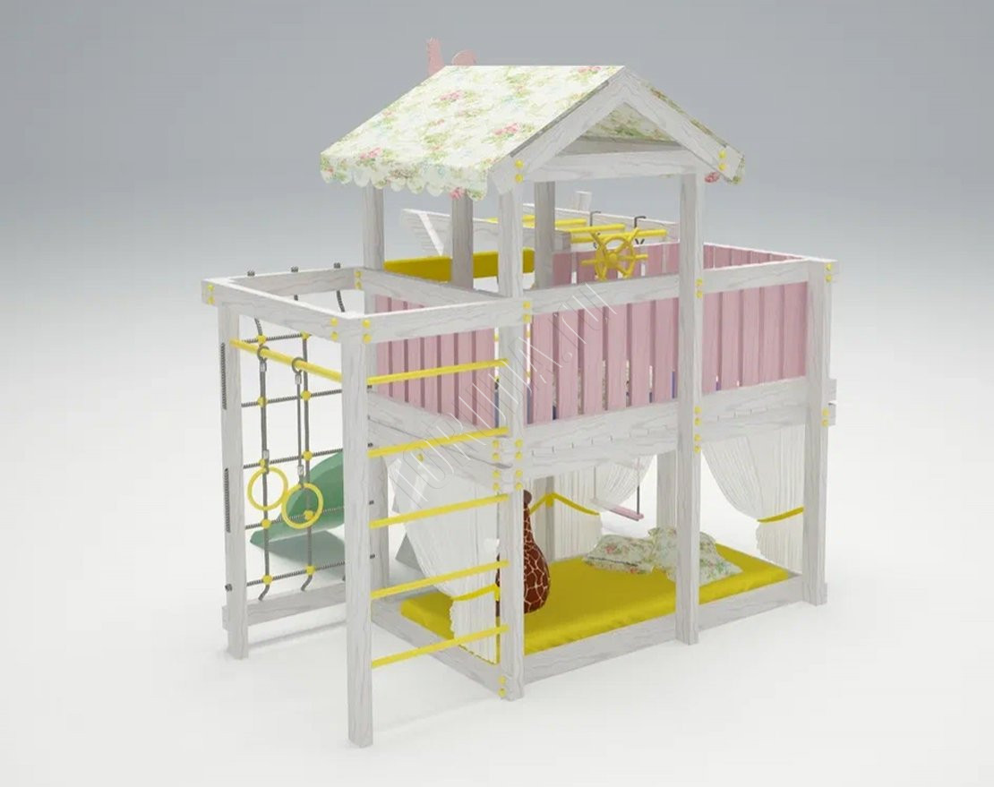 Двухъярусная площадка – разработана специально для большой семьи. Прочный каркас из массива хвойных пород выдержит нескольких детей.