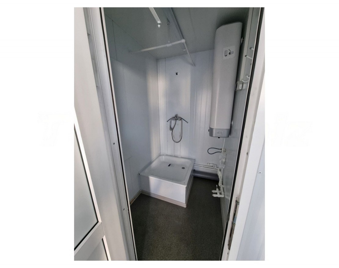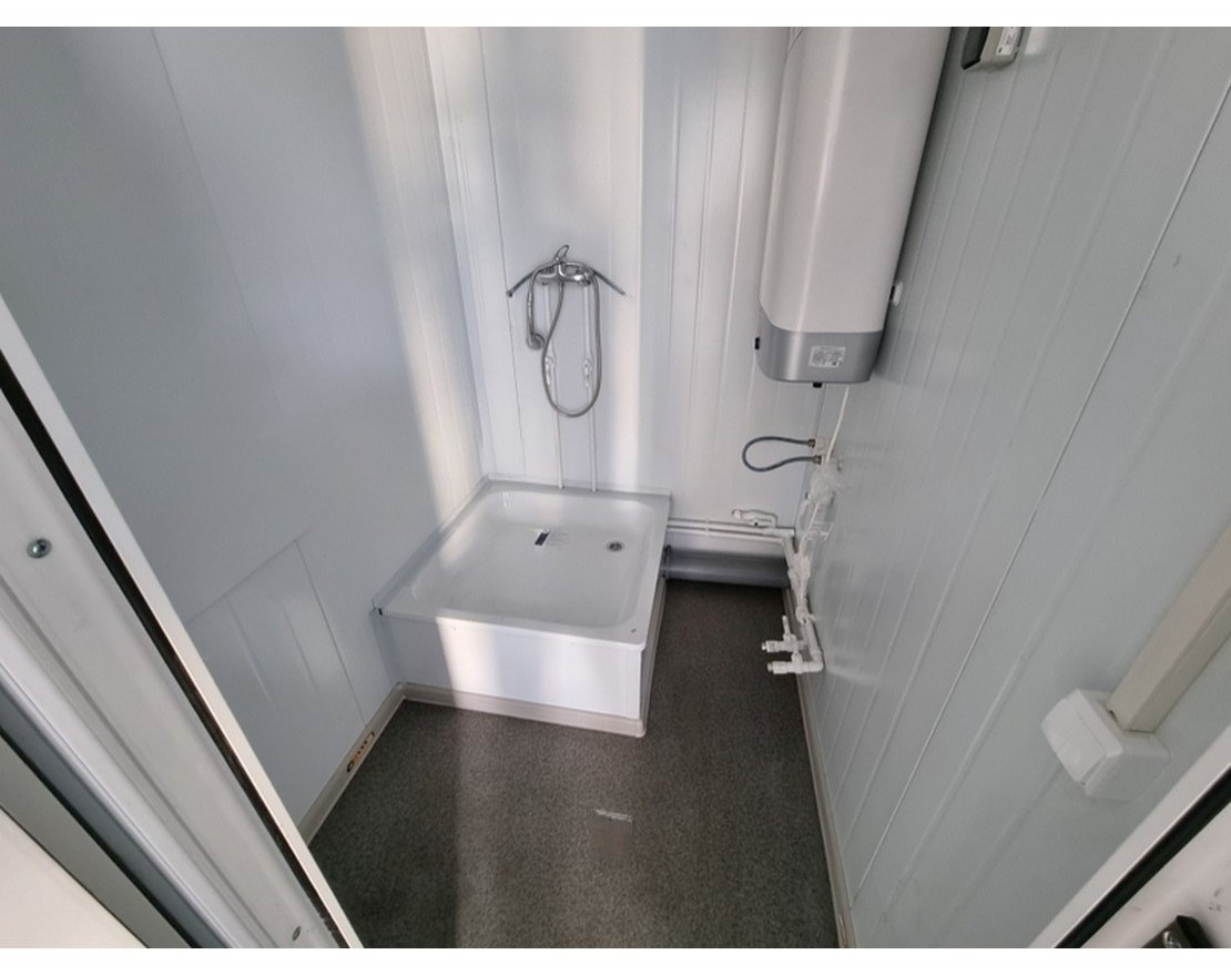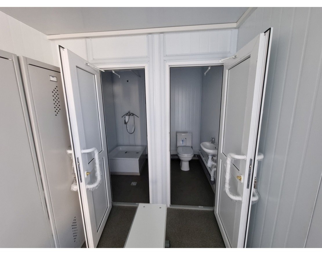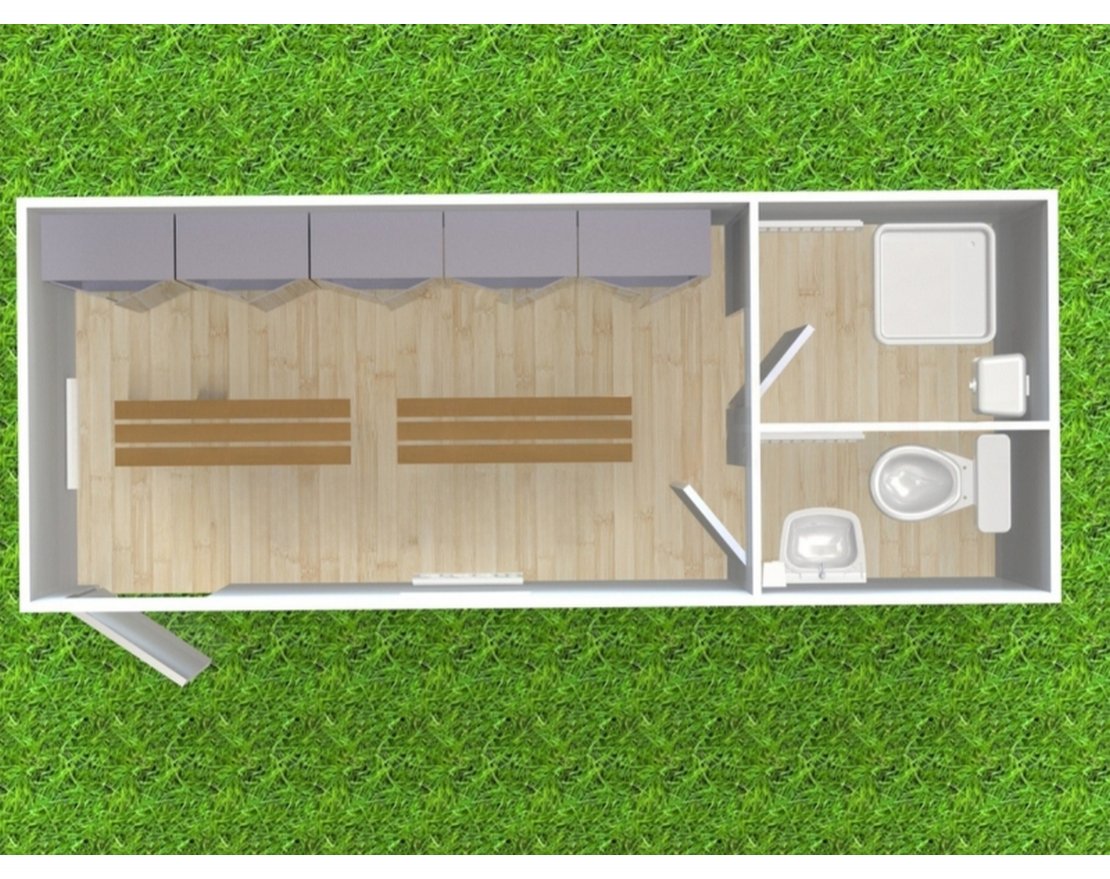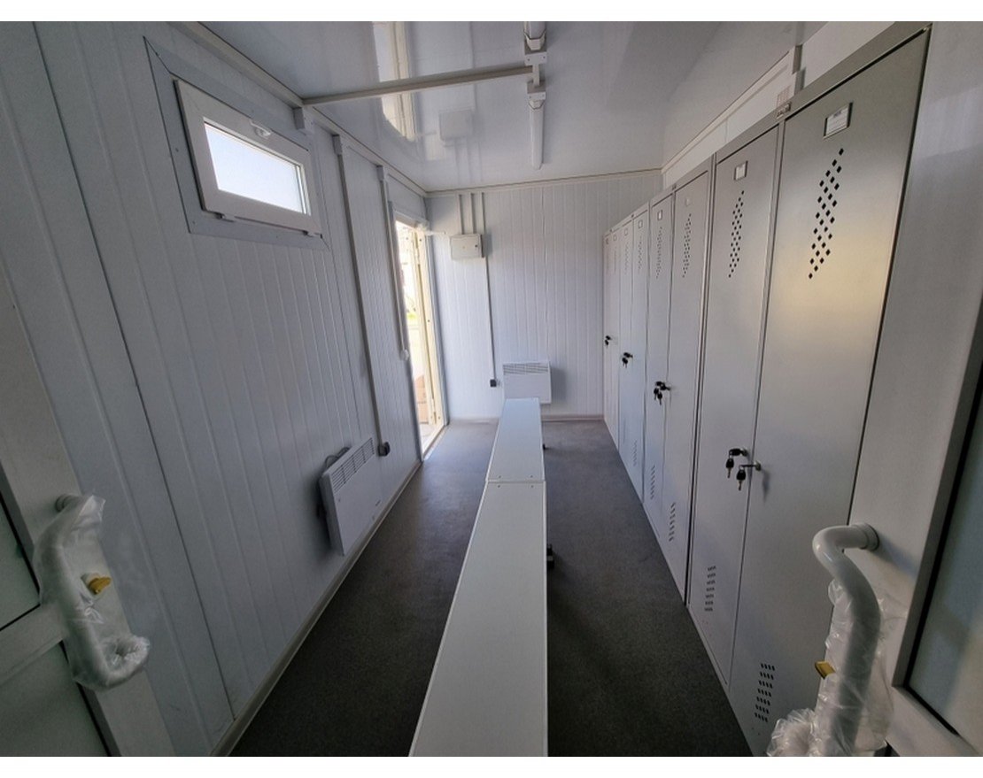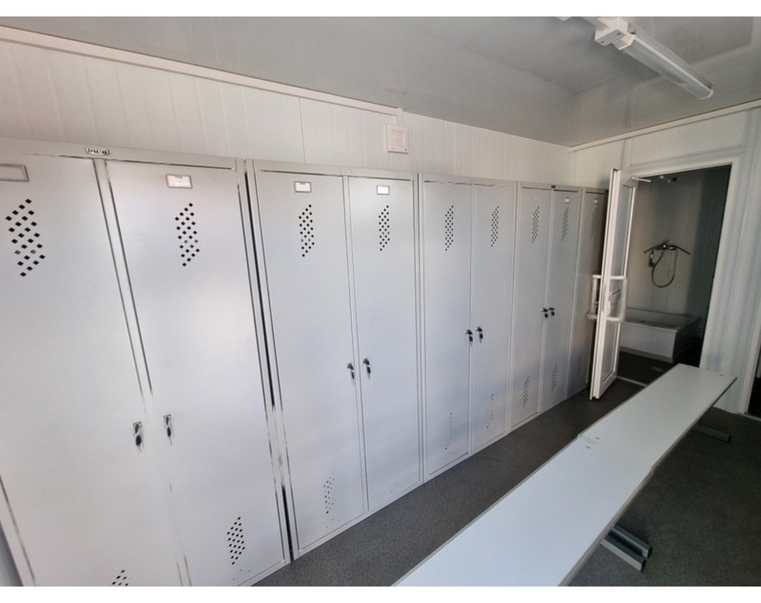 Раздевалка рассчитана на 10 человек. Для удобства переодевания здесь есть лавочки, металлические шкафчики для одежды с замками, настенные крючки. Контейнер раздевалка имеет все необходимое оборудование и полностью готов к использованию.