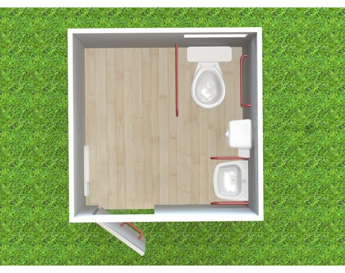 Площадь составляет 5,76 квадратных метров при высоте 2,5 метра. Она оснащена напольным унитазом, санфаянсовой раковиной и специальным комплектом поручней для маломобильных групп населения. Сантехнический блок предназначен для установки в местах небольшого скопления народа и подключается к водопроводным и канализационным сетям.