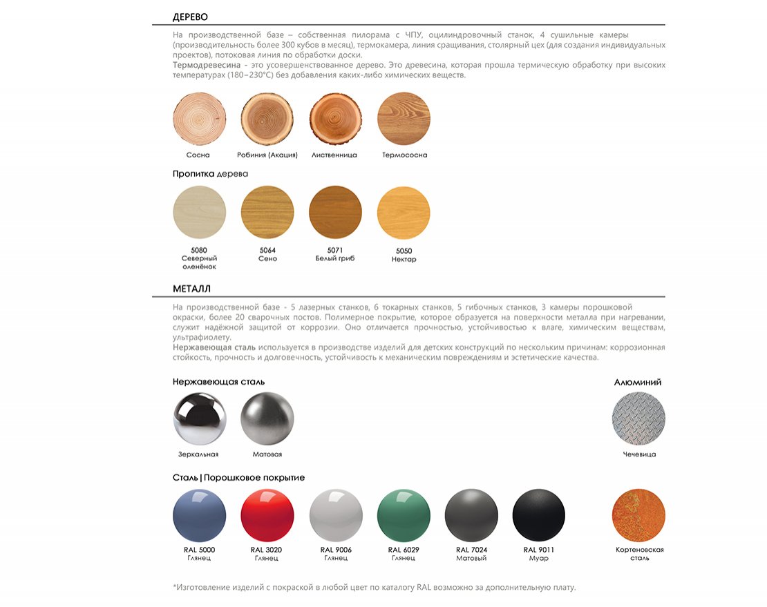 На производственной базе - 5 лазерных станков, 6 токарных станков, 5 гибочных станков, 3 камеры порошковой окраски, более 20 сварочных постов. Полимерное покрытие, которое образуется на поверхности металла при нагревании, служит надёжной защитой от коррозии. Оно отличается прочностью, устойчивостью к влаге, химическим веществам, ультрафиолету. Нержавеющая сталь используется в производстве изделий для детских конструкций по нескольким причинам: коррозионная стойкость, прочность и долговечность, устойчивость к механическим повреждениям и эстетические качества.
