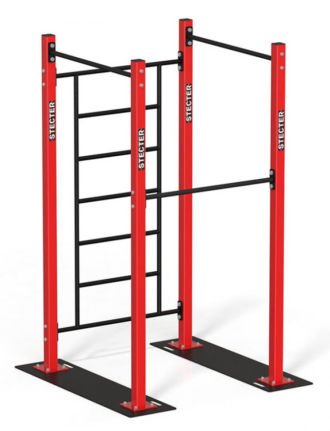 Спортивный комплекс представляет собой сборную металлическую конструкцию, состоящую из четырех опорных столбов трубы квадратного профиля, с приварными площадками для крепления к пластинам основания, трех перекладин длиной L=1120 мм., установленных на различной высоте (изменение положения высоты перекладин производится за счет дополнительно предусмотренных отверстий в опорных столбах), а так же включает в себя шведскую стенку. Монтаж элементов спортивного комплекса осуществляется с помощью болтового соединения. К каждому опорному столбу по два болтовых соединения на один элемент комплекса. Разборная конструкция спортивного комплекса имеет высокую прочность и позволяет легко производить её монтаж и демонтаж. Все элементы покрыты атмосферостойкой порошковой краской, нанесенной методом электростатического напыления с последующим обжигом в печи.