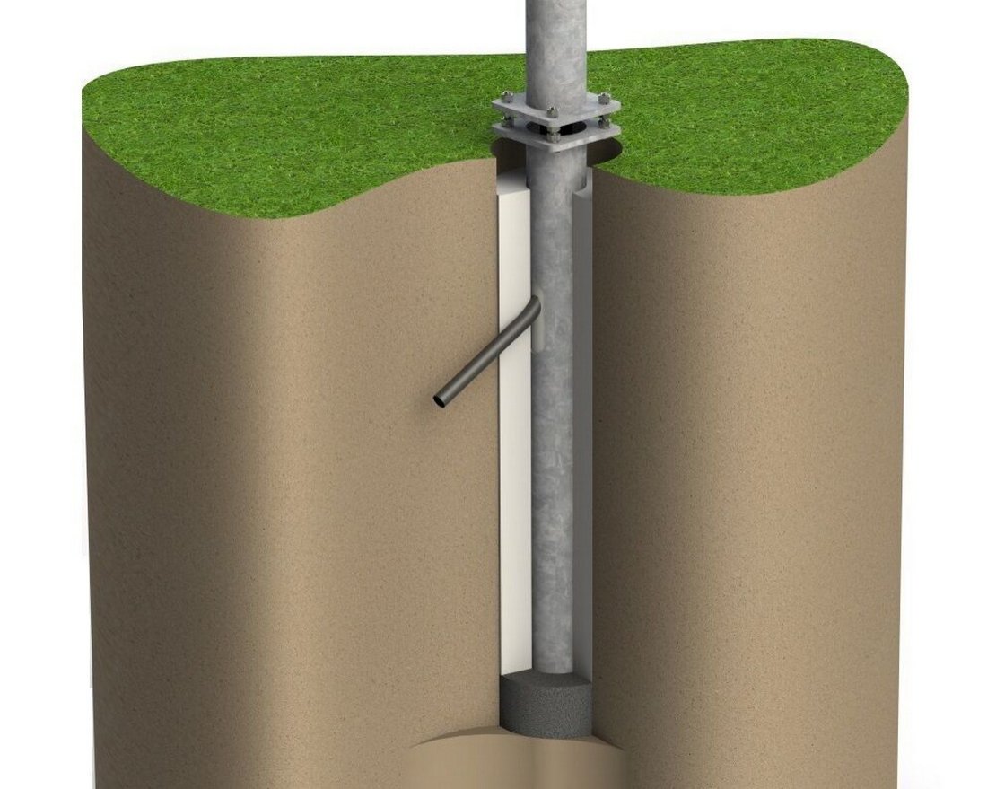Фундамент металлический служит для передачи нагрузок от установленной опоры на фундаментный блок, выполненный из бетона. Исполняется с круглыми или квадратными фланцами. Фундамент металлический имеет сквозные окна, для прохождения кабеля в тело опоры. В фундаментной части на глубине до 500мм от уровня земли имеется монтажное сквозное окно, для прохождения силового кабеля к опоре. По желанию заказчика, глубина расположения люка от земли, может быть изготовлена по индивидуальным размерам.